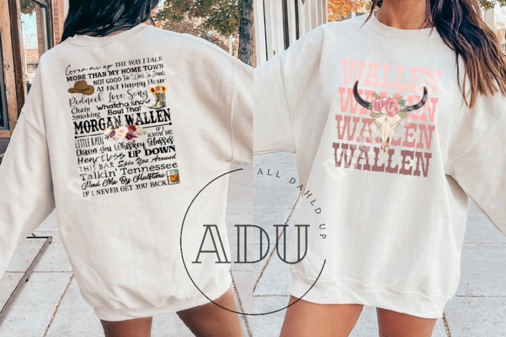 Pretty pink wallen front print, with collage of songs on the back.